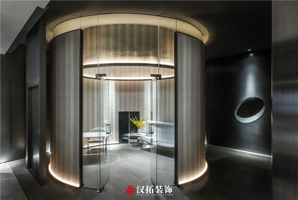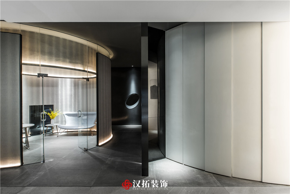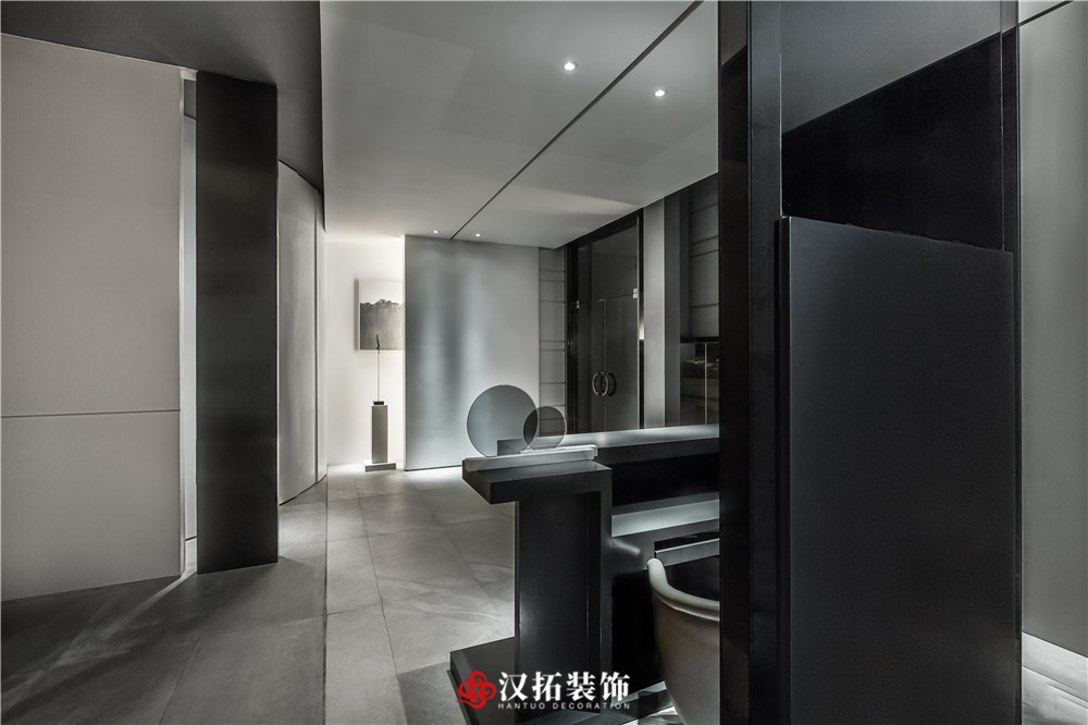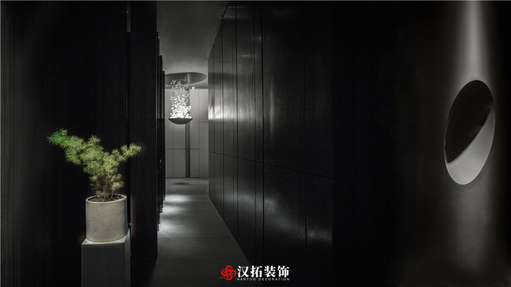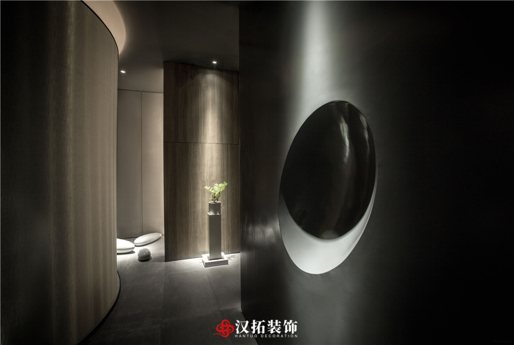 設(shè)計(jì)說(shuō)明:為了突出空間的縱深感,從入口處這個(gè)位置開始,把視覺壓的很低,留出一點(diǎn)借景窗,引人進(jìn)入到內(nèi)部空間,這里通過(guò)對(duì)比,黑白,高低設(shè)計(jì)體量的控制,通過(guò)這種平、框、曲、長(zhǎng),中國(guó)園林的手法,把整個(gè)空間該有的視覺若隱若現(xiàn)的控制在這里。