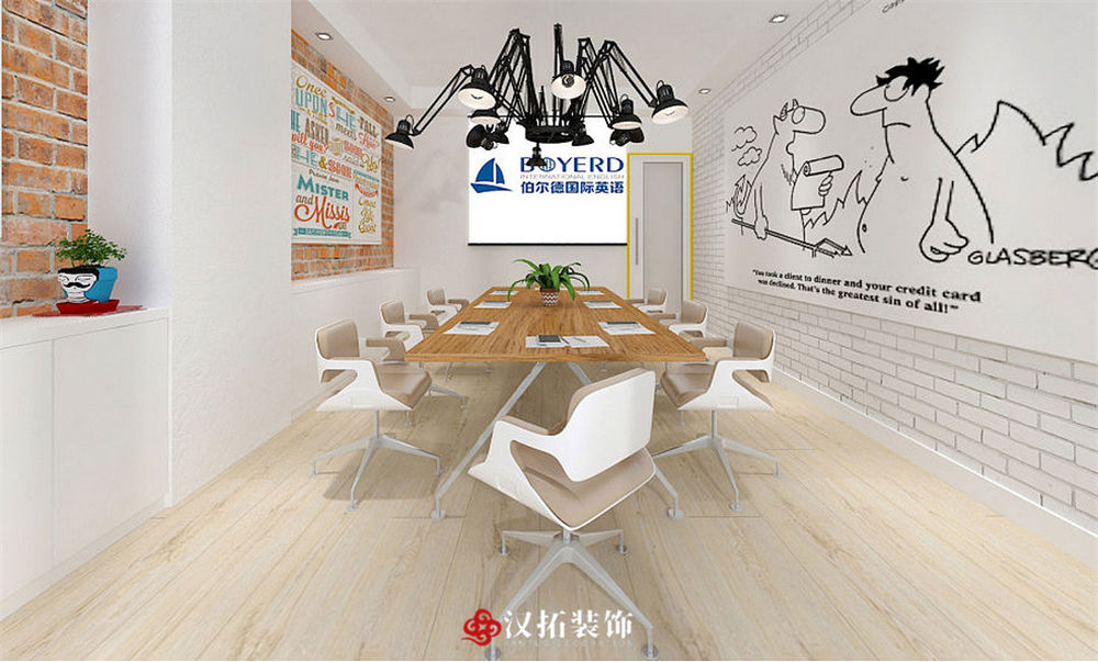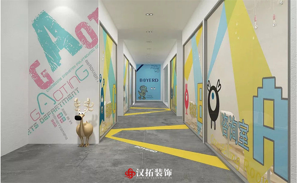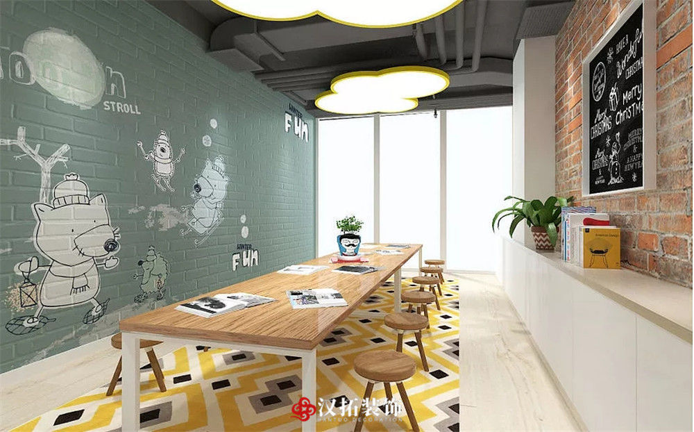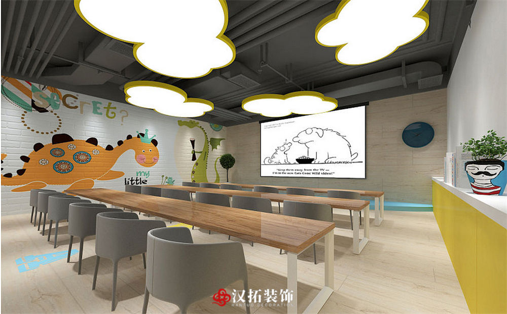 設(shè)計(jì)說明:配色簡(jiǎn)約,桌子以木質(zhì)為主,椅子適當(dāng)?shù)倪\(yùn)用暖色調(diào)提升空間的溫暖度,墻面的壁紙充滿童趣和藝術(shù)感,整個(gè)搭配使人輕松愉悅。