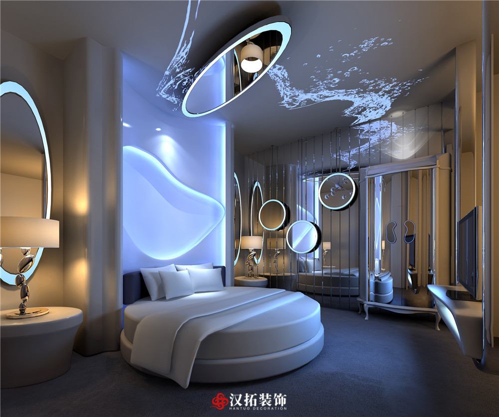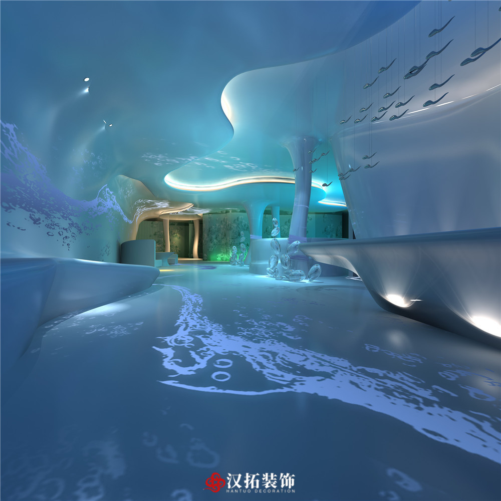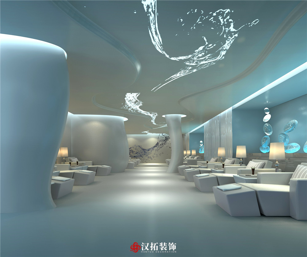 設計說明:整體以流水的通透感為設計理念,通過關系和材質的折射,提升空間的時尚感和設計感,視覺上有很強的吸引力,使人仿佛置身于潺潺流水之中,整個人身心放松。
