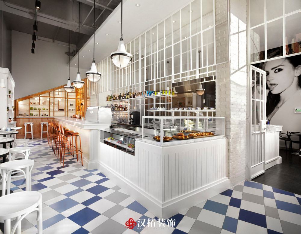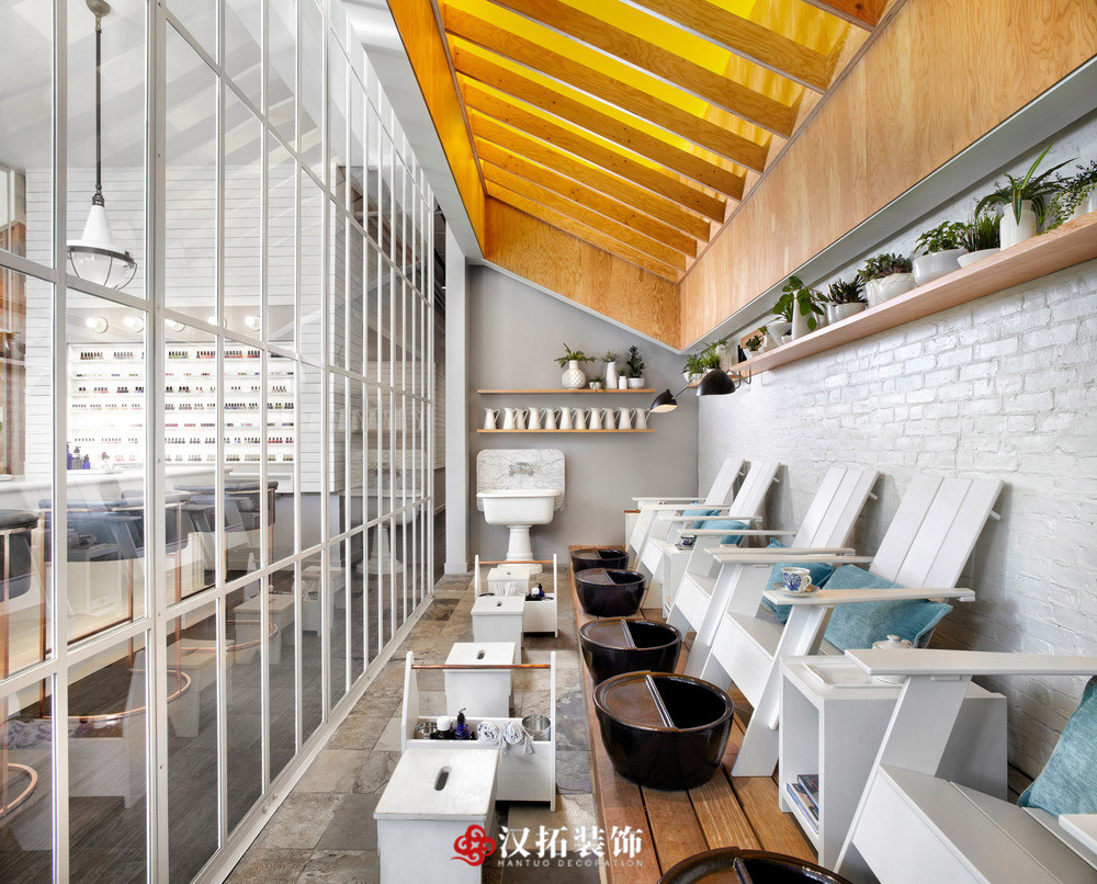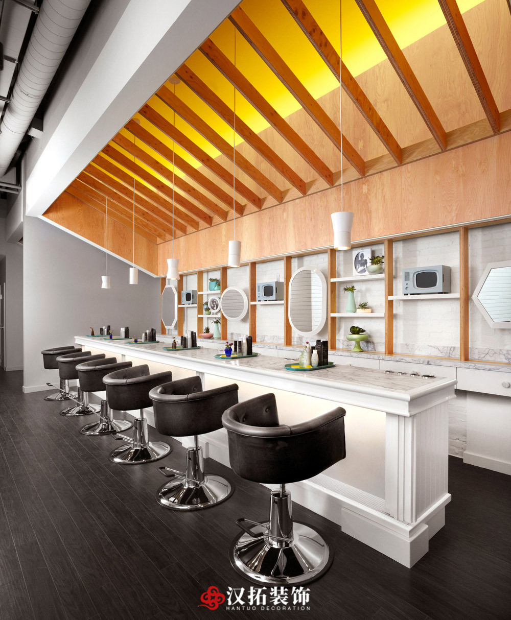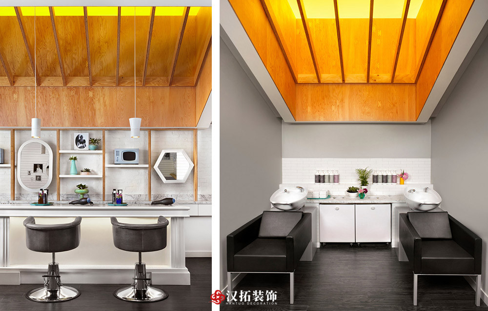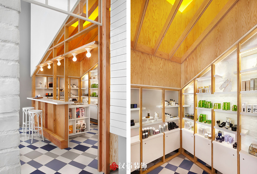 設(shè)計說明:店鋪內(nèi)的主色調(diào)選擇比較輕快明了的色彩,頂部使用大面積的明黃,使得空間更加跳躍活潑,增加通透感,店內(nèi)工具擺放整齊,干凈又美觀。