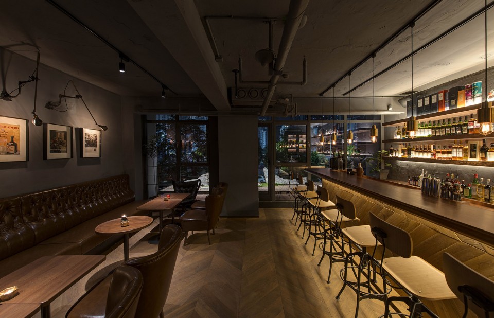 設(shè)計(jì)說(shuō)明:設(shè)計(jì)師對(duì)于酒店的裝修設(shè)計(jì)十分用心,一邊是難能可見(jiàn)的各類特殊藏酒,一邊是十米高的酒墻,各類威士忌酒琳瑯滿目。吧臺(tái)上方一排用各類威士忌酒瓶改造的吊燈,琳瑯滿目,燈泡、鎢絲閃閃發(fā)光,通過(guò)玻璃折射出魅惑的光。