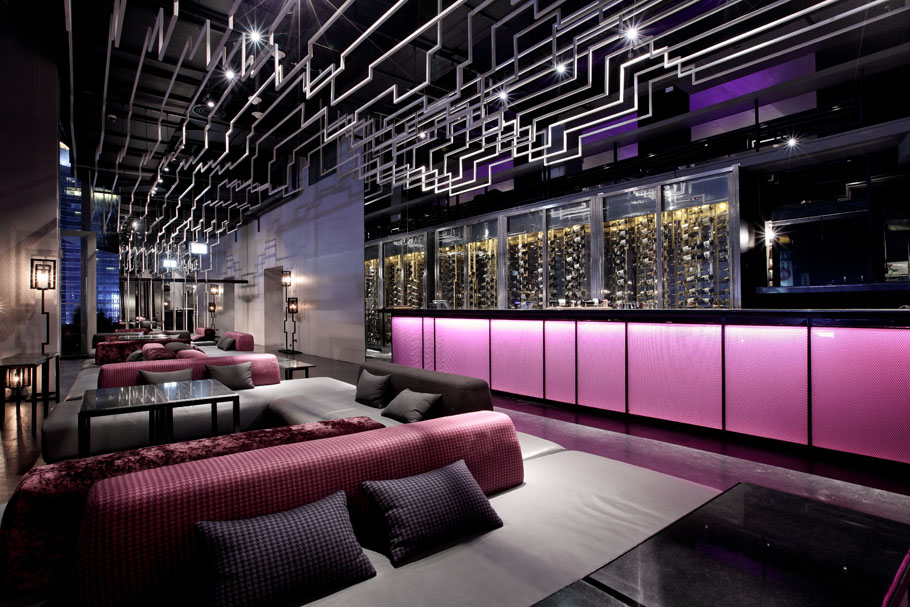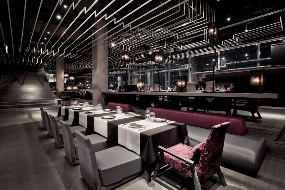 設(shè)計說明:波折線這個元素被頻繁的使用在空間中,樓梯,欄桿,座位,舞臺,燈飾,天花都有。天花上用的是波折的細(xì)鋼絲線,這些線條擋住了天花上的設(shè)備,并連同其它要素將空間變得活力,流動。室外的用餐涼亭也使用到波折線元素,其成為了空間內(nèi)美麗天際線的獨特相框。時尚的元素,家具,裝修,圖案,讓這里充滿吸引力。