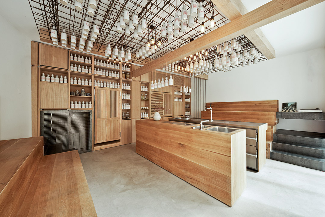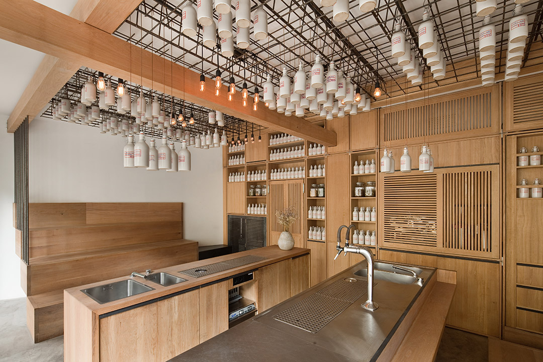 設(shè)計說明:兩側(cè)靠墻的部位是類似圓形劇場的長椅,這樣消除了一般酒吧內(nèi)調(diào)酒師和客人之間的界限。在這里,互動交流變得十分重要,座椅上的每個人都可以清晰地觀看中心兩個吧臺區(qū)混合、搖動和攪拌雞尾酒的過程。