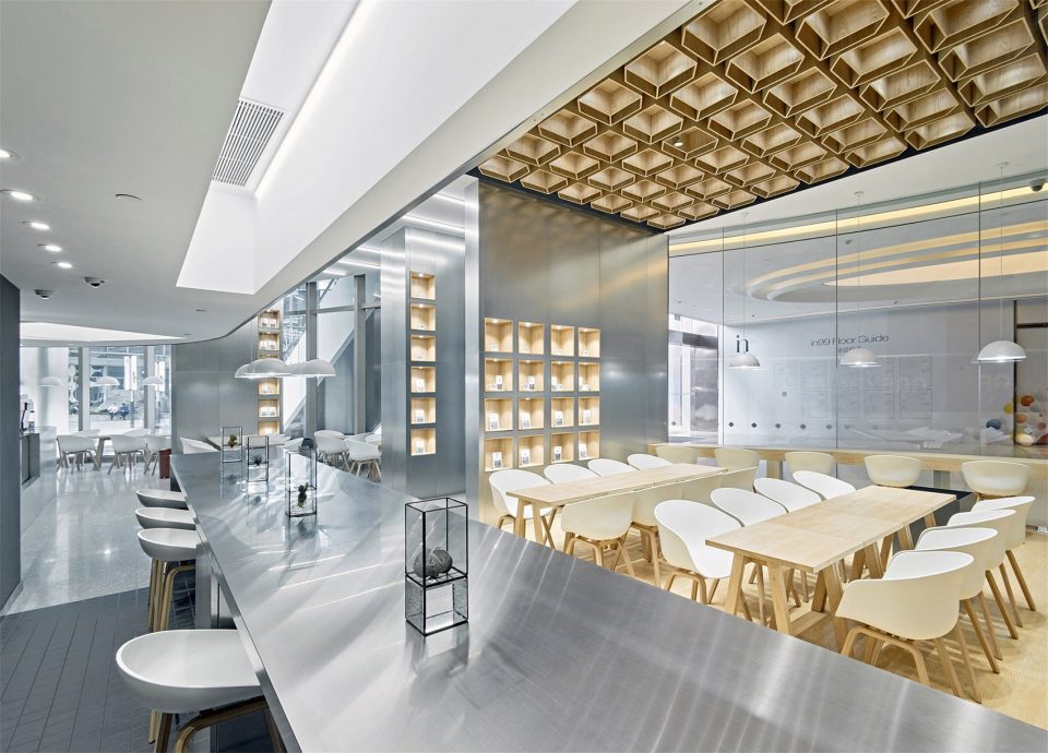 設(shè)計(jì)說(shuō)明:設(shè)計(jì)師結(jié)合了業(yè)主的理念,試圖用設(shè)計(jì)的手法來(lái)制造一種“喝咖啡的儀式感”。不同于一般的咖啡廳那種濃烈的小資情調(diào),東緹咖啡廳是有自己的特殊企業(yè)理念的,東緹的負(fù)責(zé)人希望咖啡也能喝出儀式感,希望一杯咖啡,從開磨到?jīng)_泡到制作,到最終呈現(xiàn)在食客的面前,都是標(biāo)準(zhǔn)化的、工業(yè)化的、可視化的一個(gè)過程。做咖啡的過程就如同身處實(shí)驗(yàn)室,因此,漢拓設(shè)計(jì)師對(duì)于該咖啡廳的設(shè)計(jì)首先從燈光入手,并沒有采用其他咖啡廳昏暗燈光配慢搖的風(fēng)格,而是給予了明亮的射燈造型,讓制造咖啡的每一個(gè)過程都清晰無(wú)比的得以呈現(xiàn),也體現(xiàn)了企業(yè)標(biāo)準(zhǔn)化的訴求。
