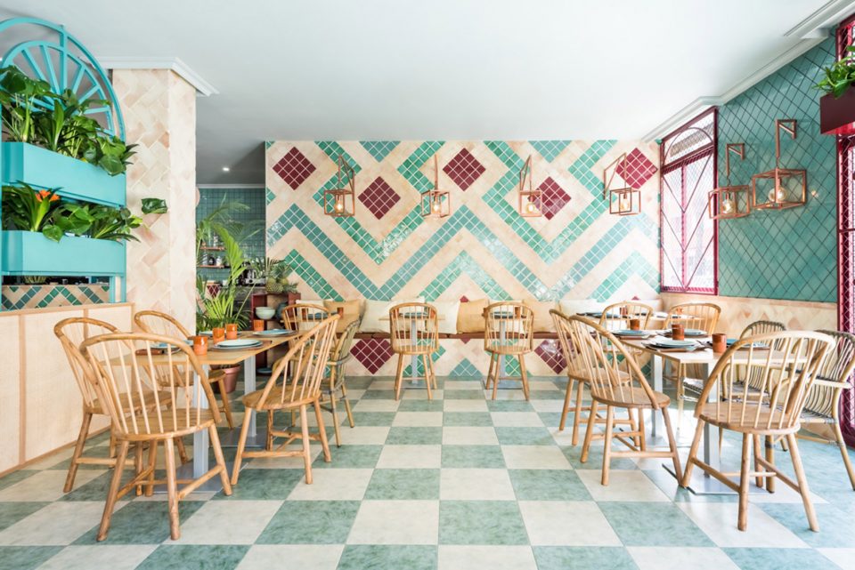 設(shè)計(jì)說明:該餐廳是由南京漢拓裝飾工程有限公司裝修的。該店的定位是做休閑餐廳,因此設(shè)計(jì)師對(duì)于該店的設(shè)計(jì)十分到位,整個(gè)基調(diào)充滿了異域風(fēng)情,從主色調(diào)就可以看出,選用的是翡翠綠和櫻桃紅的結(jié)合,顏色飽滿、很有張力,讓人充滿幻想,背景墻使用了馬賽克小方磚進(jìn)行鋪設(shè)裝飾,風(fēng)格自成一體。燈具采用了造型夸張的金屬框造型,掛在墻面與室內(nèi)設(shè)計(jì)融為一體。地磚的顏色稍淺,整個(gè)餐廳顯得干凈、清爽.......軟裝綠植選用了熱帶植物,視覺上與室內(nèi)設(shè)計(jì)風(fēng)格一致。